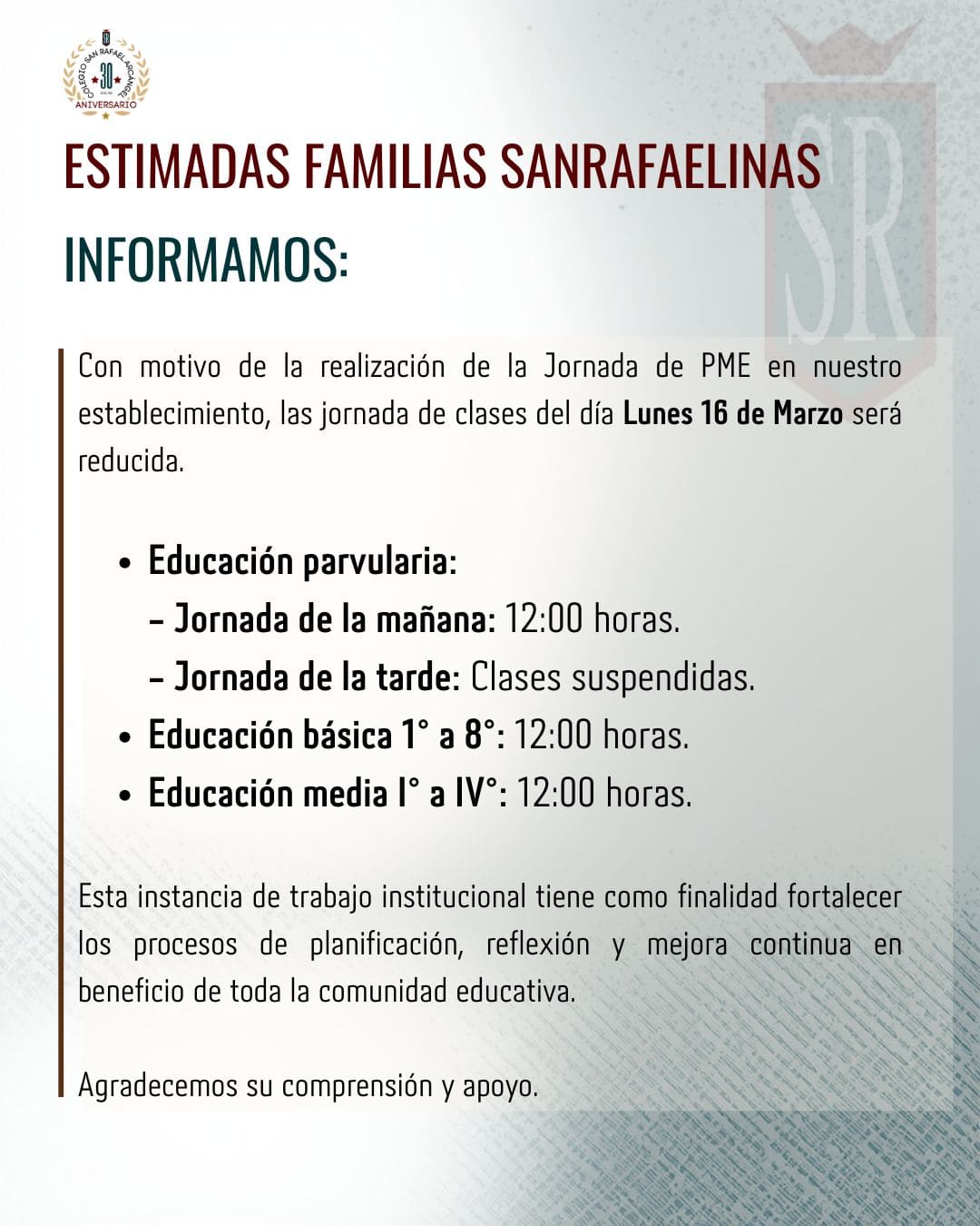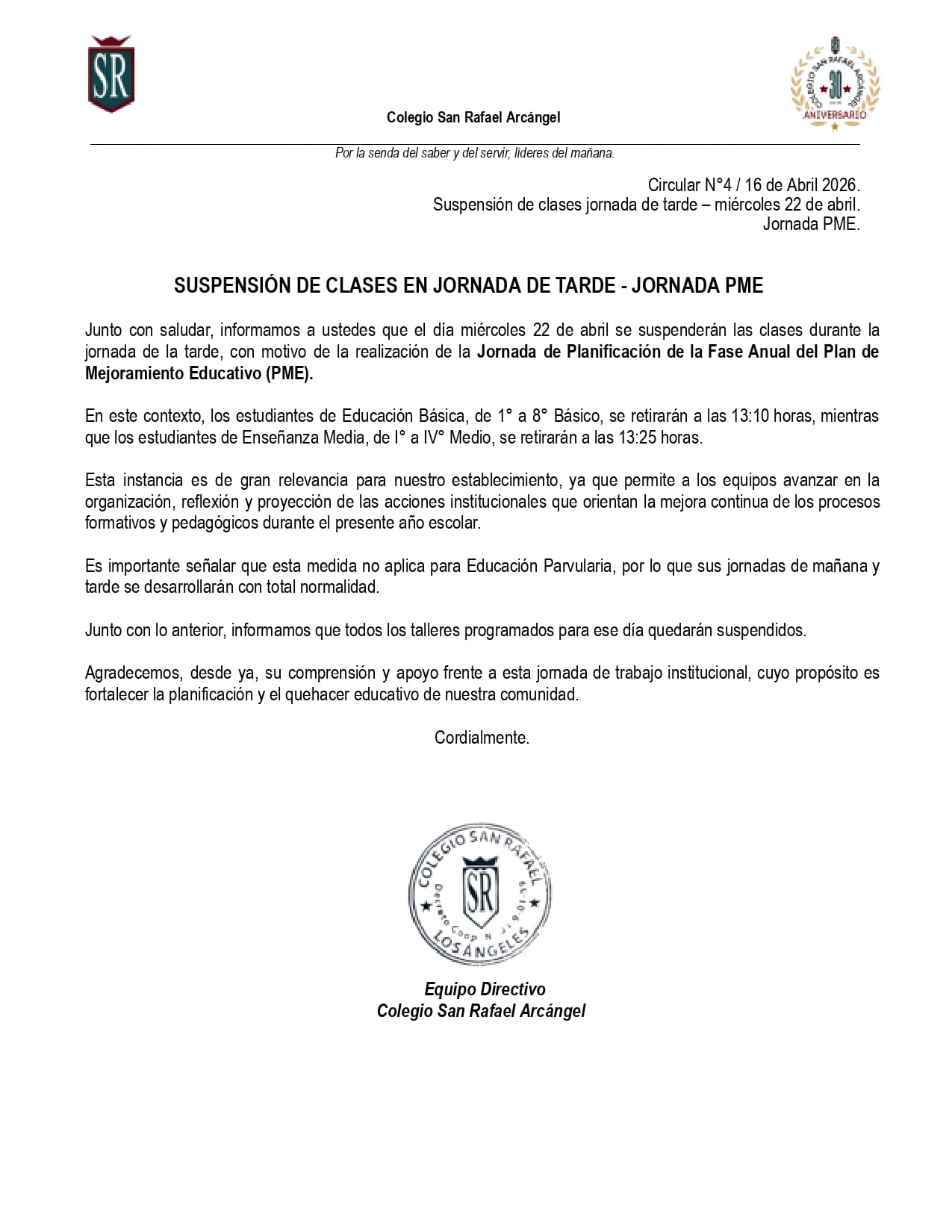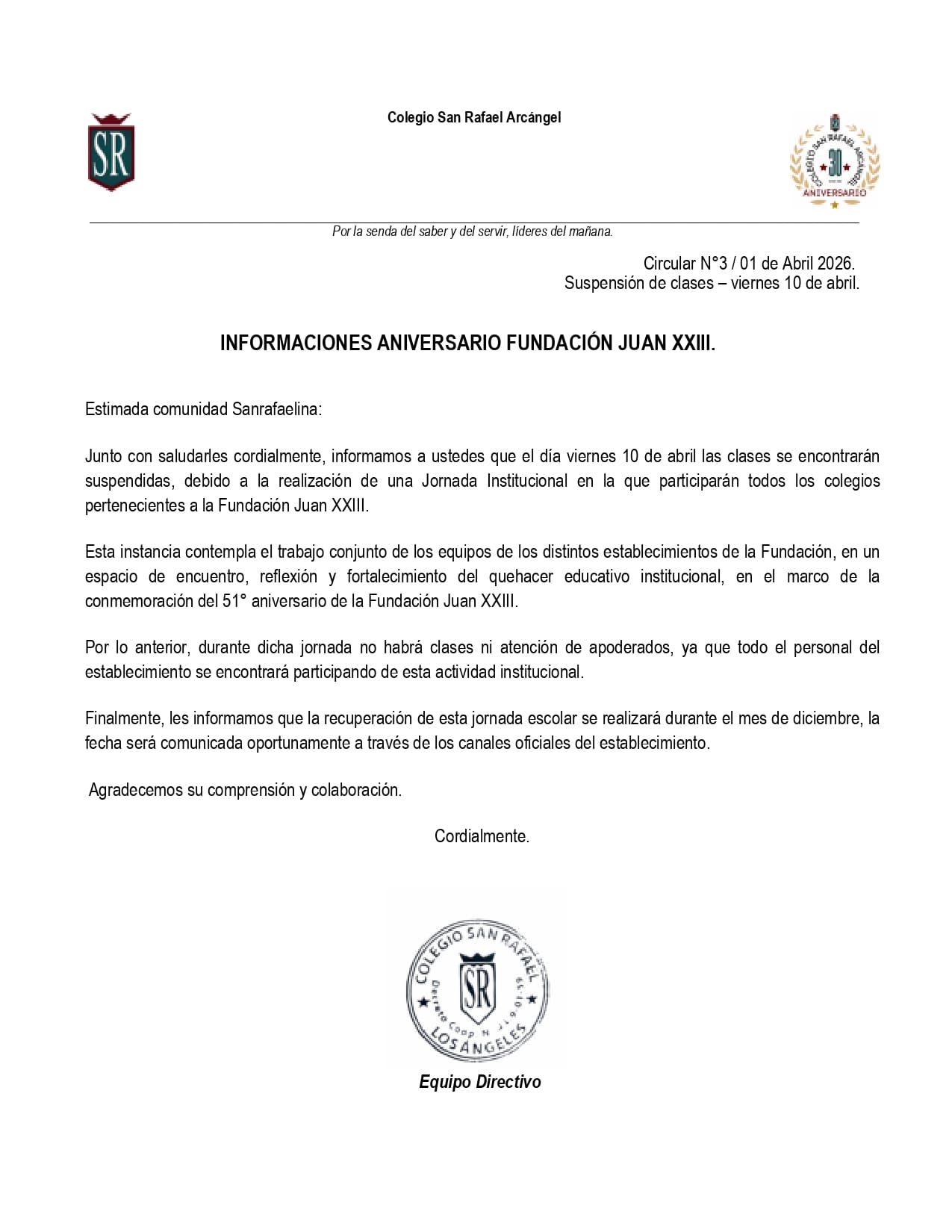 Estimadas familias Sanrafaelinas:
