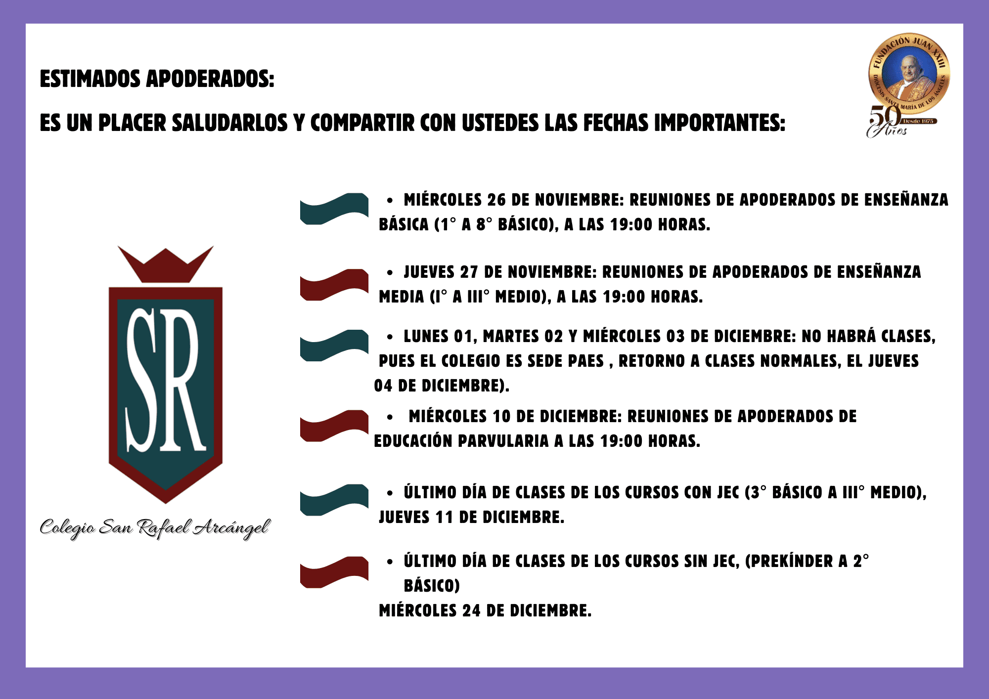 Estimados Apoderados, se les recuerda que el 15 de octubre se les envió un COMUNICADO con la CIRCULAR N° 580 desde Appoderado informando que desde este año se les solicita cumplir con las deudas económicas para poder matricular al periodo 2026: Además se adjuntan documentos importantes que se deben leer: Procedimiento Acreditación de [...]